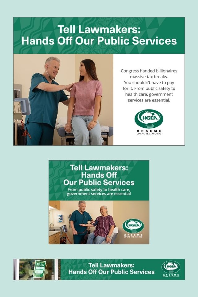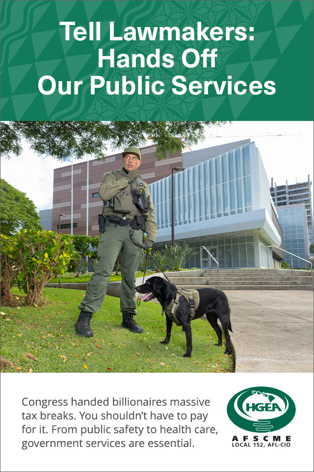 As lawmakers scramble for ways to cover the shortfall, we’re telling them to keep their hands off our public services. Government workers provide essential services that the public relies on. If they are impacted by cuts, who will be there to answer when Hawaii calls?
